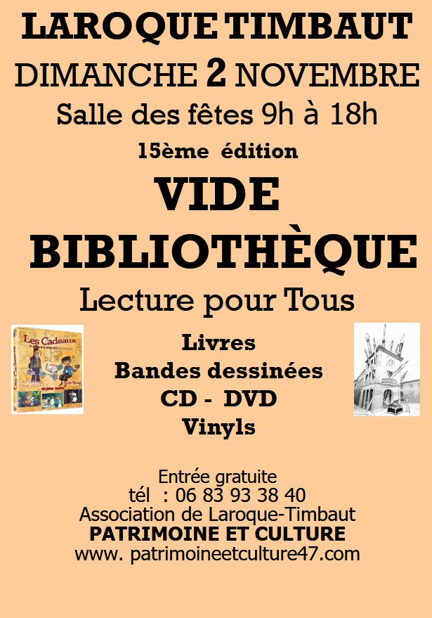 L’association Patrimoine et Culture propose sa 15iéme édition de son vide bibliothèque « Lecture pour Tous » le dimanche 2 novembre toute la journée dans la salle des fêtes du village avec vente de livres, de bandes dessinées, DVD CD, vinyles.
