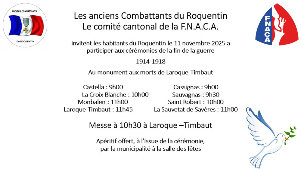 Les Anciens Combattants du Roquentin et le Comité cantonal de la F.N.A.C.A. invitent les habitants à participer aux cérémonies en hommage aux soldats morts pour la France.